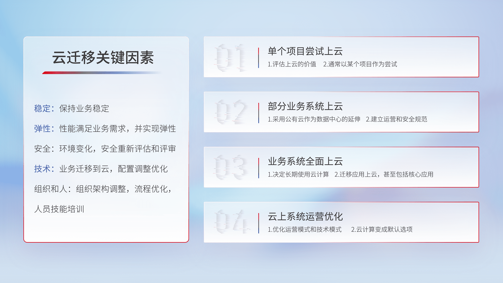 结合实际业务,,,从规划设计、、云平台选型、、、云原生改造、、、数据迁移、、、集成交付,,,迁移全过程为客户识别最佳上云路径,,做好风险识别管理,,,,设计网络架构、、、身份权限、、、、安全审计合规、、、、操作审计、、、、日志审计、、、监控告警策略、、、多站点容灾设计等,,对云上基础设施进行整体规划,,提升IT治理水平,,,以满足弹性、、高可用、、、高性能的需求。。。